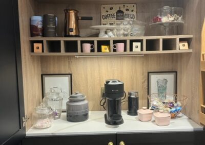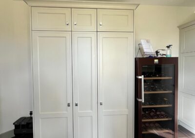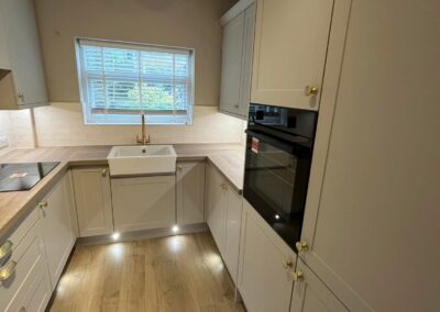 Gorgeous ivory kitchen with solid surface worktop. Colour changing lights above the units allow the customer to set the mood. Bespoke coffee larder and bespoke mantel with integrated storage above and to the sides.
