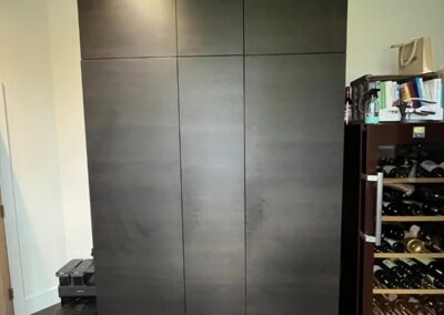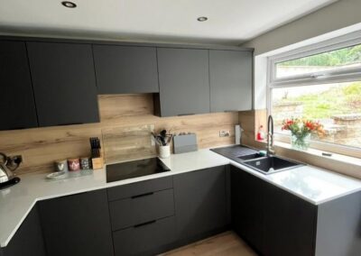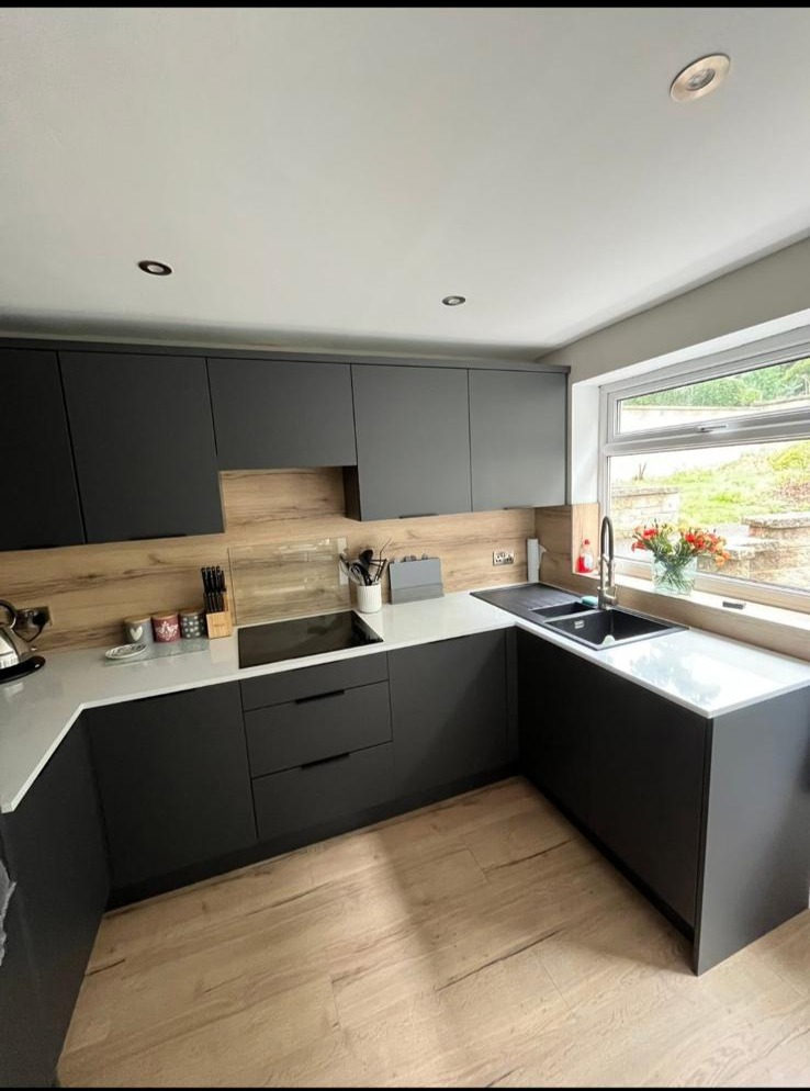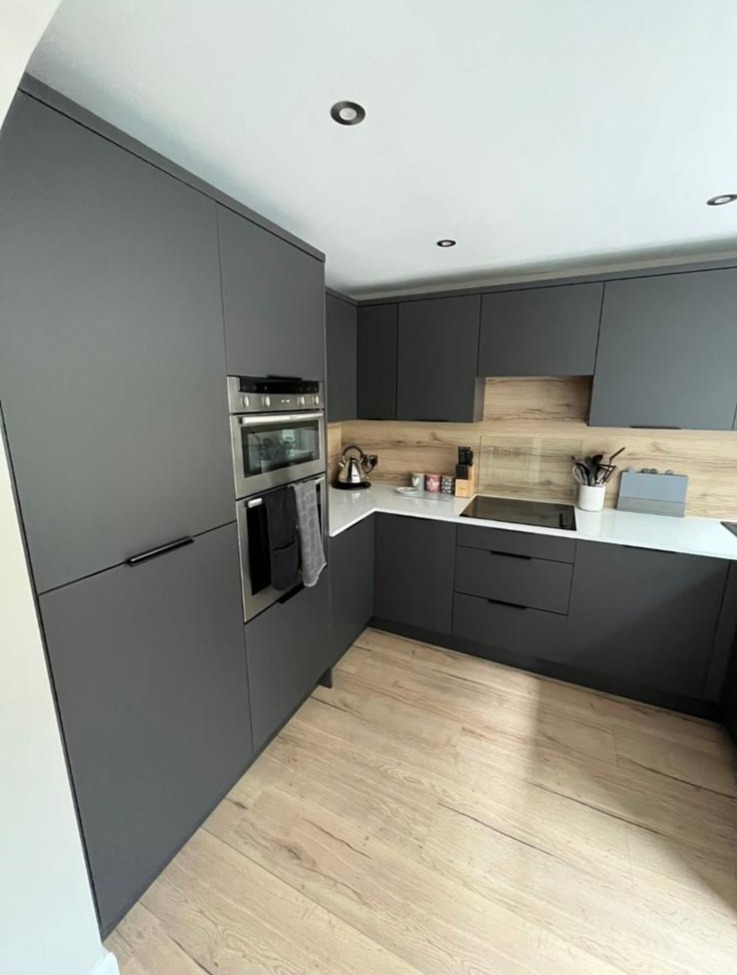 Beautiful handless graphite kitchen with Soapstone Quartz worktops. Our customer had previously had a kitchen fitted before by us and returned when they wanted to upgrade their current kitchen which had been opened out into a spacious kitchen/dining area.