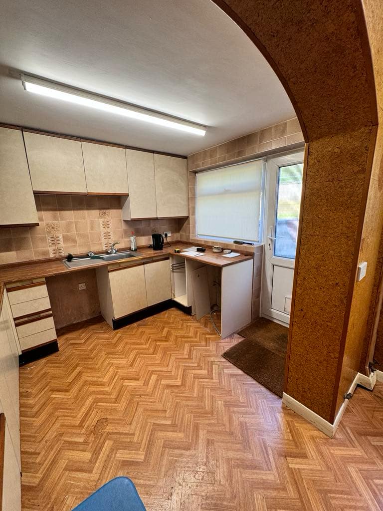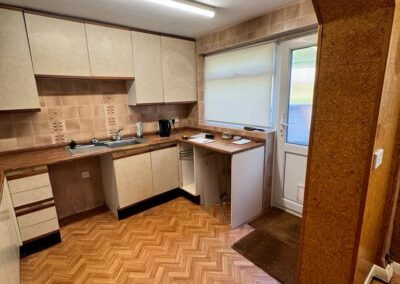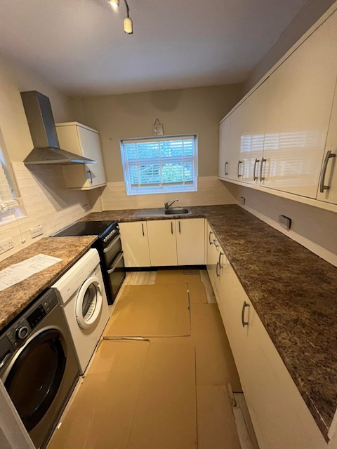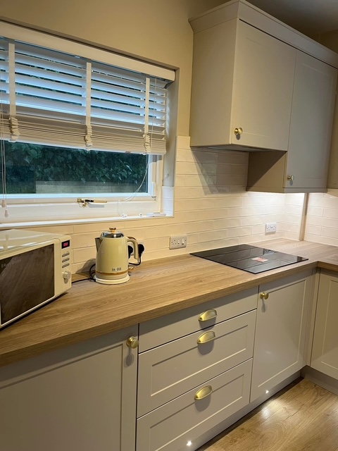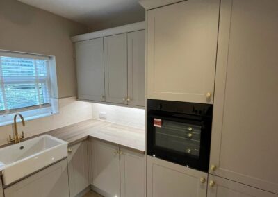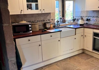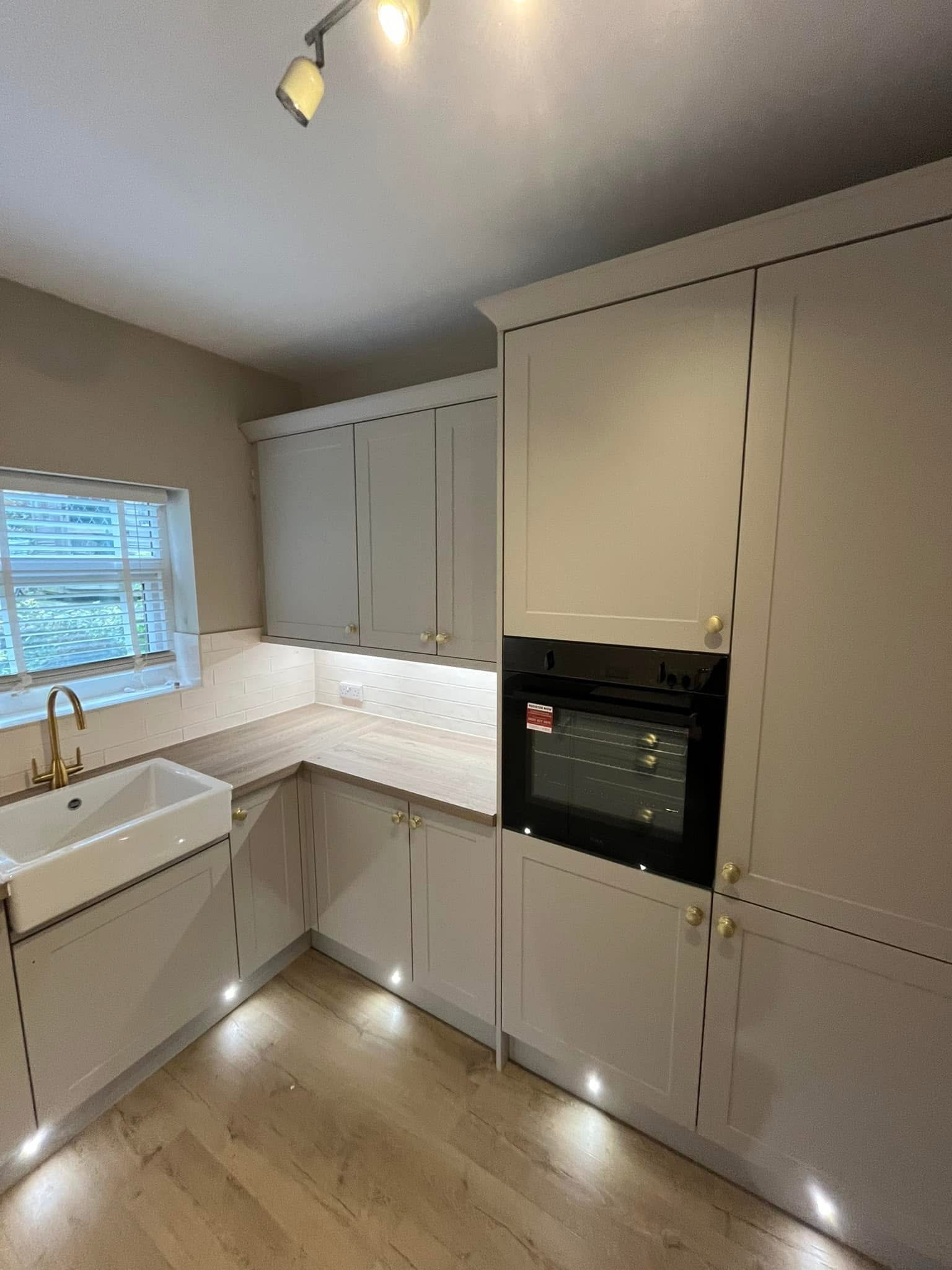 A before and after example of kitchen door replacement and what an amazing difference it makes. The customer replaced their doors, sink & tap and worktop with Bella Tulleymore in Matt Mussell and Dakar. The wooden worktops tie in the original flooring nicely. A splashback and upstands give a sleeker look.